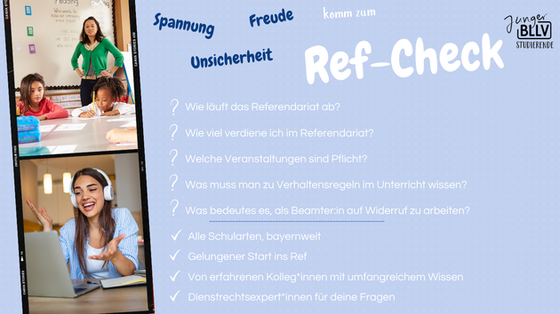 Der Einstieg ins Referendariat ist ein großer Schritt. Damit dieser gelingt, informieren Junger BLLV, BLLV-Kreisverbände sowie die BLLV-Fachgruppen Gymnasium und Realschule in Ref-Check-Seminaren über alles, was man über das Referendariat wissen musst.