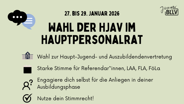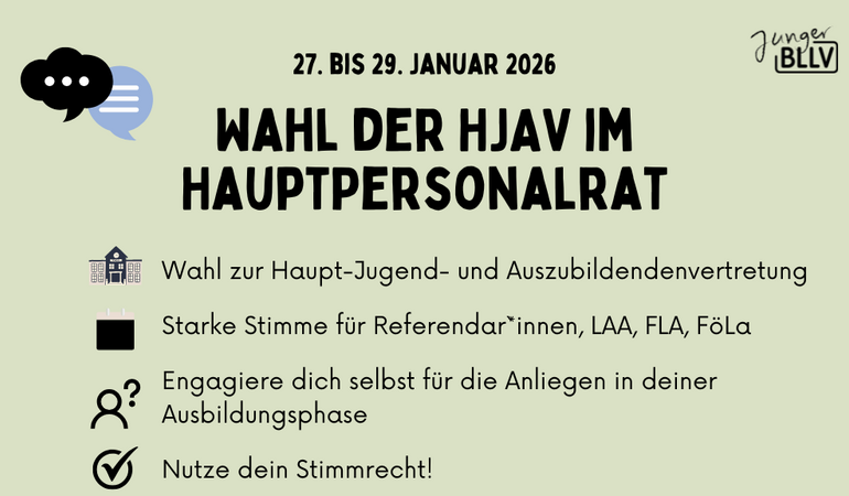 Nutze als Lehramtsanwärter*in, Referendar*in, Fachlehreranwärter*in oder Förderlehreranwärter*in dein Wahlrecht für die Wahl zur Haupt-Jugend- und Auszubildendenvertretung (kurz: HJAV). 2026 findet die Wahl von 27. bis 29. Januar statt.  » mehr
