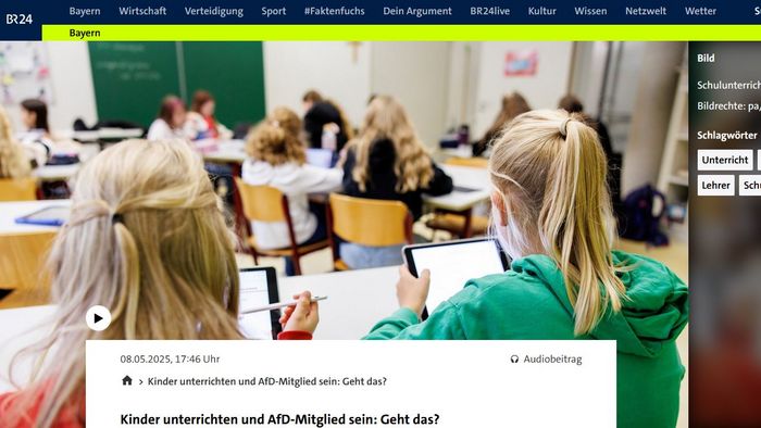 BR24 stellt in einem Bericht vom 8. Mai die Frage: “Kinder unterrichten und AfD-Mitglied sein: Geht das?”. Diese Frage hatte auch Bayerns Innenminister Joachim Herrmann (CSU) offen gestellt. Er wollte wörtlich wissen: "Kann jemand, der der AfD angehört, noch Lehrer sein für unsere Kinder?".