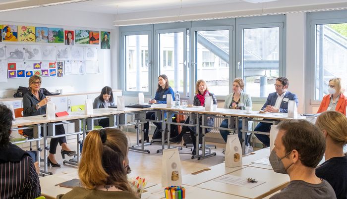 „Es ist Aufgabe eines Lehrerverbandes immer wieder aufmerksam zu machen“, sagt BLLV-Präsidentin Simone Fleischmann beim Besuch der Mittelschule in Unterschleißheim zusammen mit bayerischen Bildungspolitikerinnen und -politikern.