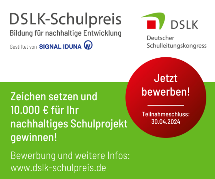 Am 8. November findet beim diesjährigen DSLK in Düsseldorf die Preisverleihung für den Schulpreis für nachhaltige Entwicklung statt. Mit dem Preis, der 2023 erstmals an 5 Schulen (darunter das Werner von Siemens Gymnasium aus Bayern) vergeben wurde, setzt der Verband Bildung und Erziehung (VBE) - Dachverband des BLLV - gemeinsam mit FLEET EDUCATION ein Zeichen, Bildung für Nachhaltige Entwicklung (BNE) als fächerübergreifenden Schwerpunkt der pädagogischen Arbeit an Schulen zu setzen.