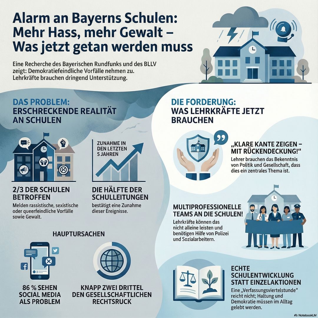 Laut Recherche des Bayerischen Rundfunks mit Kooperation des BLLV verzeichnen zwei Drittel der Schulen in Bayern immer mehr demokratie- und menschenfeindliche Vorfälle. BLLV-Präsidentin Fleischmann fordert bessere multiprofessionelle Unterstützung.