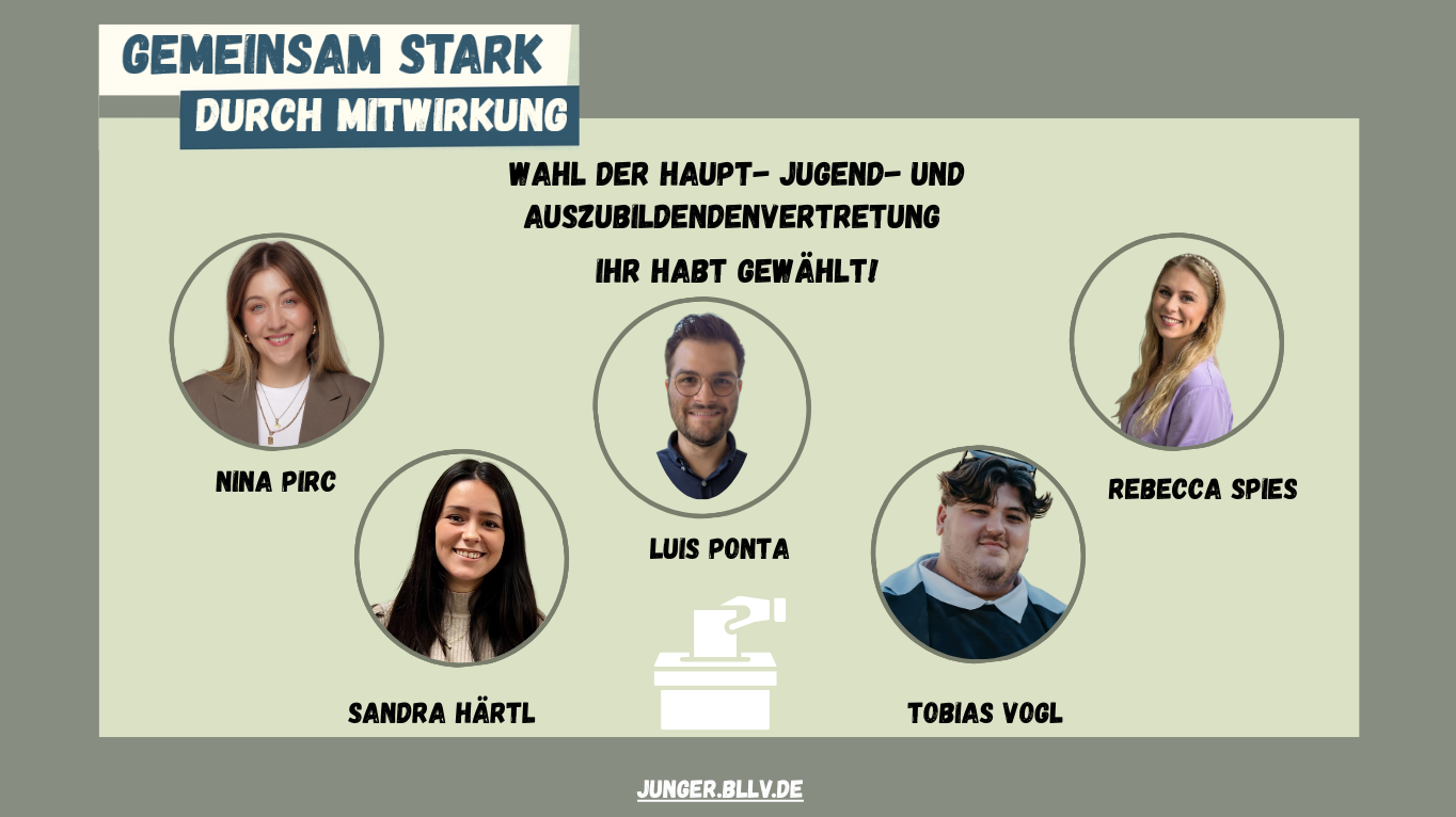 Bei der letzten Wahl vom 27. bis 29. Januar 2026 konnten wir 73,6 % der Stimmen erreichen und damit 5 von 7 Plätzen für den BLLV sichern! Folgende fünf Junglehrkräfte aus dem BLLV wurden in das Gremium der Haupt-Jugend- und Auszubildendenvertretung am Kultusministerium gewählt: