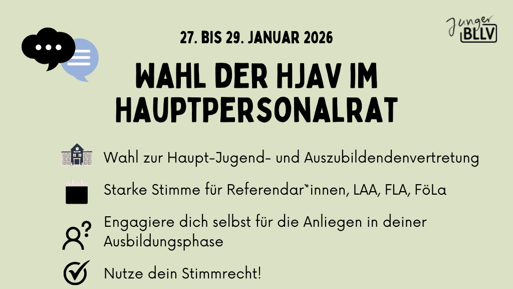 Die Stimme und das Engagement bei der Haupt-Jugend- und Ausbildungsvertretungswahl (HJAV) sind wichtig, weil sie jungen Lehrkräften, Auszubildenden und Nachwuchskräften eine starke Vertretung in den Gremien der Personalräte bieten. Die Haupt-Jugend- und Ausbildungsvertretung setzt sich für die Interessen und Anliegen der Jugendlichen und Auszubildenden im öffentlichen Dienst, etwa in Schulen, ein und sorgt dafür, dass deren Stimme bei wichtigen Entscheidungen im Kultusministerium und anderen Institutionen gehört wird. Durch die Wahl wird sichergestellt, dass junge Kolleginnen und Kollegen in den Personalräten aktiv mitwirken und ihre Ausbildung und Arbeitsbedingungen verbessern können. Zudem stärkt das Engagement der Jugendvertretung den direkten Dialog mit Politik, Schule und Gesellschaft, um die Belange junger Lehrkräfte und Auszubildender wirksam zu vertreten und Veränderungen anzustoßen.